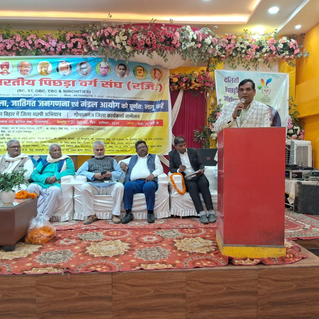 अखिल भारतीय पिछड़ा वर्ग संघ के तत्वाधान में देश व्यापी पिछड़ा – अति पिछड़ा जगाओ यात्रा किया जा रहा है इसी क्रम में बिहार प्रांत के गोपालगंज जिला मुख्यालय स्थित रॉयल पैलेस में राष्ट्रीय अधिवेशन का आयोजन किया गया जिसमे कई राज्यों से पहुंचे संघ के पदाधिकारियों, सामाजिक, बौद्धिक संगठनों के संचालकों, लेखकों, चिंतकों तथा महिलाओं सहित हज़ारों कार्यकर्ताओं ने एक सूर से देश में जातिगत जनगणना करवाकर सभी वर्गो को आबादी के अनुसार समान हिस्सेदारी देने l एवं मंडल आयोग को पूर्णतः लागू करने की गगनभेदी नारों के साथ जोरदार आवाज बुलंद की तथा मांगें पूरी नहीं होने पर सड़क पर उतर कर आंदोलन करने की चेतावनी दी।
