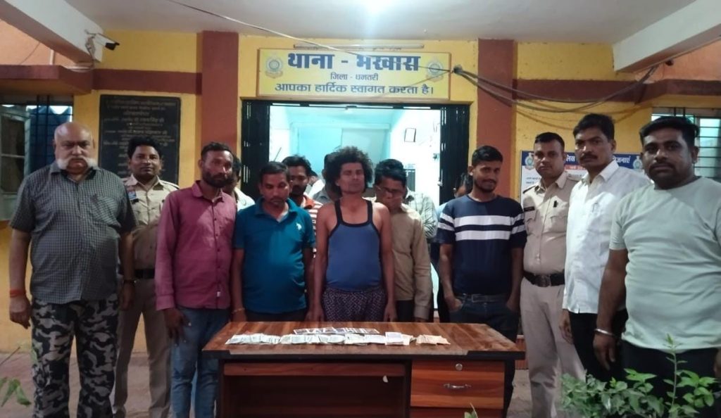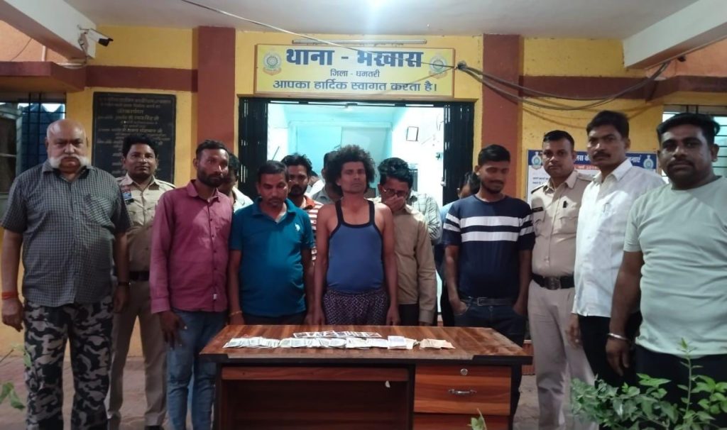 धमतरी जिला के अंतर्गत आने वाले थाना भखारा को मुखबिर से सूचना मिली की रूपनारायण साहू के घर के सामने कुछ लोग 52 पत्ती ताश से हारजीत का दांव लगाकर जुआ खेल रहे है की सूचना पर थाना प्रभारी भखारा द्वारा हमराह स्टॉफ के मुखबिर के बताये स्थान पर पहुंचकर घेराबंदी कर रेड कार्यवाही किया गया तो कुछ लोग पुलिस को देखकर भाग गये तथा कुछ लोग जुआ खेलते रंगे हाथ पकडे गये।