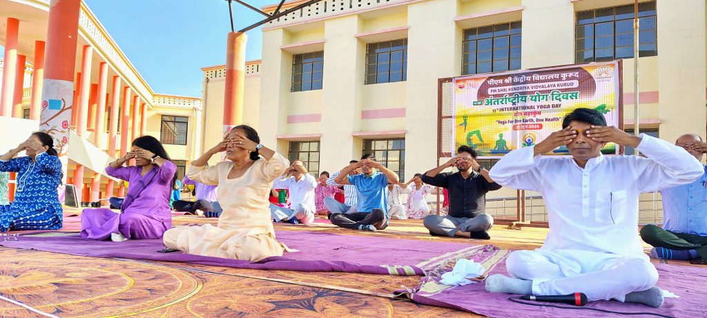 अंतरराष्ट्रीय योग दिवस के उपलक्ष्य में पी एम श्री के वि कुरूद में दिनांक 21 जून 2025 को योग महाकुंभ का आयोजन किया गया। इस वर्ष की थीम “Yoga for One Earth, One Health” रही, जिसे विद्यार्थियों और शिक्षकों ने बड़े उत्साह से अपनाया। कार्यक्रम की शुरुआत में विद्यालय प्रांगण में उपस्थित सभी विद्यार्थियों और शिक्षकों ने अंतरराष्ट्रीय योग दिवस पर माननीय प्रधानमंत्री नरेन्द्र मोदी जी का लाइव संबोधन एवं योग प्रदर्शन कार्यक्रम सामूहिक रूप से देखा। प्रधानमंत्री जी के संदेश ने विद्यार्थियों में योग के प्रति जागरूकता और उत्साह को और अधिक बढ़ाया।कार्यक्रम के मुख्य अतिथि के रूप में योगाचार्य तामेश्वर साहू तथा उनके सहयोगी योगाचार्य नरेंद्र कुमार साहू (आर्ट ऑफ लिविंग संस्था से) पधारे। विद्यालय की प्राचार्य महोदया ग्लोरिया मिंज द्वारा उनका पुष्पगुच्छ व पारंपरिक गमछा भेंट कर आत्मीय स्वागत किया गया। योगाचार्यद्वय ने विद्यार्थियों और शिक्षकों को विभिन्न योगासनों और ध्यान मुद्राओं का अभ्यास कराया एवं उनके शारीरिक और मानसिक लाभों के बारे में विस्तारपूर्वक बताया। विद्यार्थियों ने ध्यानपूर्वक भाग लिया और योग को दैनिक जीवन का हिस्सा बनाने की प्रेरणा ली।कार्यक्रम के अंत में विद्यालय प्राचार्या ग्लोरिया मिंज ने अपने प्रेरणास्पद उद्बोधन में योग को जीवन शैली का अभिन्न अंग बनाने का आह्वान किया।उन्होंने कहा कि योग केवल शारीरिक अभ्यास नहीं, बल्कि मानसिक और आत्मिक संतुलन का माध्यम है। योग से विद्यार्थियों में अनुशासन, एकाग्रता और सकारात्मक दृष्टिकोण विकसित होता है, जो उनके संपूर्ण विकास में सहायक होता है।कार्यक्रम का समापन दिव्या साहू द्वारा धन्यवाद ज्ञापन के साथ हुआ जिसमें उन्होंने सभी अतिथियों , योग प्रशिक्षकों ,प्राचार्य महोदया , शिक्षकगण एवं छात्रों के सहयोग के लिए आभार व्यक्त किया।