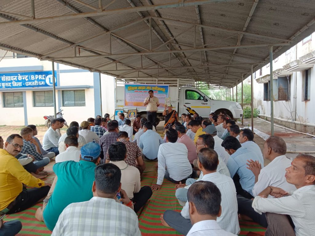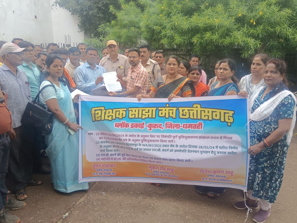 शिक्षक साझा मंच के बैनर तले युक्तियुक्त करण में 2008 सेट अप का पालन क्रमोन्नति, पेंशन सहित चार सूत्रीय मांग एवं कुरूद बी ई ओ के द्वारा युक्तियुक्तकरण में मनमानी तरीके से शिक्षकों को परेशान व हताश करने के दृष्टि कोण से किए गए कार्यों के विरोध में एक दिवसीय धरना प्रदर्शन के साथ साथ बी ई ओ कुरूद को हटाने के साथ साथ उनके विरूद्ध कार्रवाई की मांग किया गया कुरूद बी ई ओ के कार्य शैली , शिक्षकों को हताश व मानसिक रूप से परेशान करने विभागीय कार्यों को ना करने के विषय को लेकर सर्व शिक्षक संघ, तथा कर्मचारी फ़ेडरेशन ने पूर्व में भी हटाने का मांग माननीय विधायक अजय चंद्राकर व स्थानीय जन प्रतिनिधी के अलावा जिला कलेक्टर संभाग आयुक्त कार्यालय रायपुर तथा प्रदेश के मुखिया को किया गया है इसी बीच कुरूद बी ई ओ ने युक्तियुक्त करण में शासन के नियम को ताक में रखकर कर अपना नियम व मौखिक निर्देश कहकर कुरूद ब्लाक अधिक से अधिक स्कूलों का जो एक परिसर में नहीं है उसे भी युक्तियुक्त करण किया ताकि शिक्षक परेशान हो तथा कुरूद में अपना नियम चलाकर कुरूद के चार स्कूलों के अंगेजी व्याख्याताओं को हटाया गया है जबकि धमतरी नगरी मगरलोड में उसी दर्ज़ संख्या पर नहीं हटाया गया है एवं शासन का निर्देश है शिक्षक विहीन स्कूलों को शिक्षक व्यवस्था किया जाए पर सेजेश कुरूद के गणित जीव विज्ञान संस्कृत के सभी व्याख्याताओ को बाहर किया गया है उस स्कूल में अभी लगभग 300 विद्यार्थी हैं शिक्षको का कोई व्यवस्था नहीं किया गया है इस प्रकार गणित के दोनों विज्ञान के दिनों व संस्कृत के शिक्षक को हटा दिया गया है वहा इस विषय के शिक्षक ही नहीं है ब्लाक में पद रहते हुए शिक्षकों को अन्य जिले में भेजा गया पद को झुपाया गया सहायक शिक्षक बहनों को ब्लाक में स्थान रहते हुए अन्य ब्लाक भेजा गया कुछ सहायक शिक्षक का अभी अभी दिव्यांग मेडिकल प्रमाण पत्र बनवाए हैं उनसे सेटिंग कर वरिष्ठ शिक्षकों को अतीशेश बनाया गया जबकि प्रारंभ से जी दिव्यांग है उसे ही राहत देने नियम में उल्लेख है इस प्रकार शिक्षकों को केवल और केवल हताश व परेशान करने के दृष्टि कोण से कार्य करने वाले एवं मनमानी करने वाले बी ई ओ को हटाते हुए उनके विरूद्ध कार्यवाही की मांग को लेकर आज विरोध प्रदर्शन किया गया