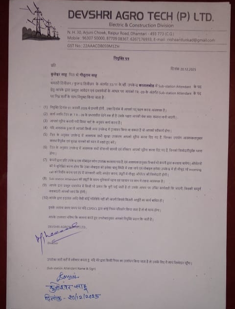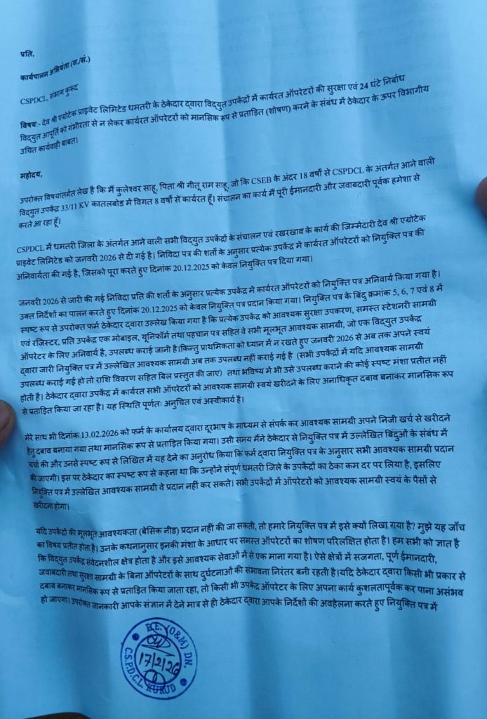 धमतरी जिला के CSPDCL के अंतर्गत संभाग कुरूद के विद्युत उपकेंद्रों में कार्यरत ऑपरेटरों ने ठेका कंपनी देवश्री एग्रोटेक प्राइवेट लिमिटेड पर गंभीर आरोप लगाए हैं।विदित हो कि 33/11विद्युत उपकेंद्र कातलबोड़ के ऑपरेटर को नियुक्ति पत्र में उल्लेखित मूलभूत सुविधाएं उपलब्ध कराने की मांग करने पर सामग्री प्रदान करने के बजाय अनावश्यक रूप से परेशान किया जा रहा है तथा दबाव और दहशत का वातावरण बनाया जा रहा है।